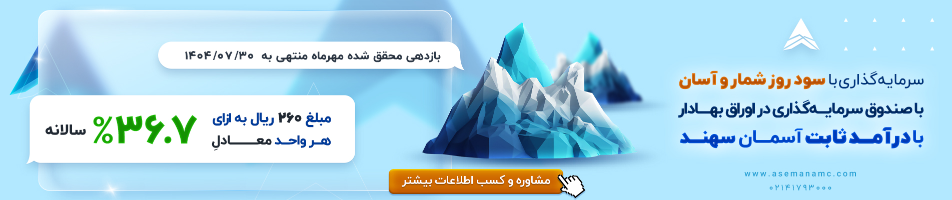 | ۸ | ۱۴۰۴/۰۸/۰۲ | 10,022 | 10,017 | 10,045 | ۲۸ | ۰ | ۱,۶۱۸,۷۰۰,۱۷۸ | ۰ | ۱,۱۶۹,۹۷۷,۶۰۶ | ۴۴۸,۷۲۲,۵۷۲ | ۴,۴۹۴,۸۷۵,۸۴۲,۴۰۲ |